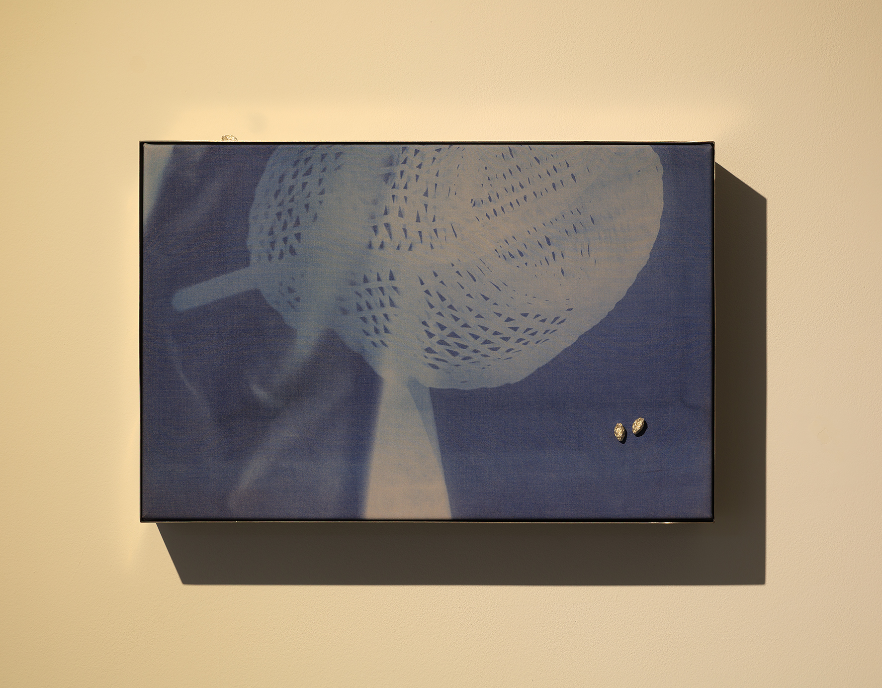 Stainless Steel, Cyanotype Printed Photogram on Cotton, Silver Raisin